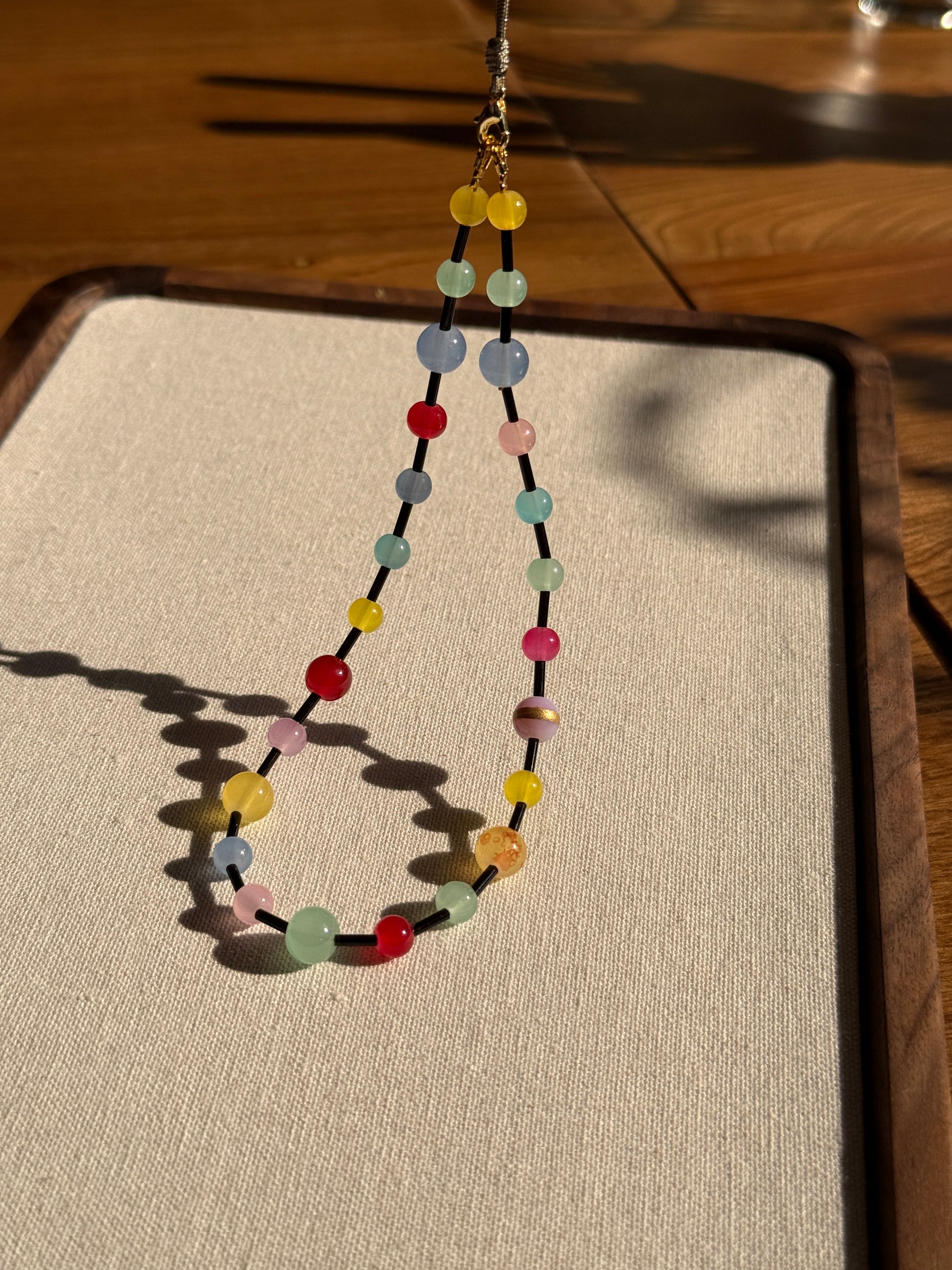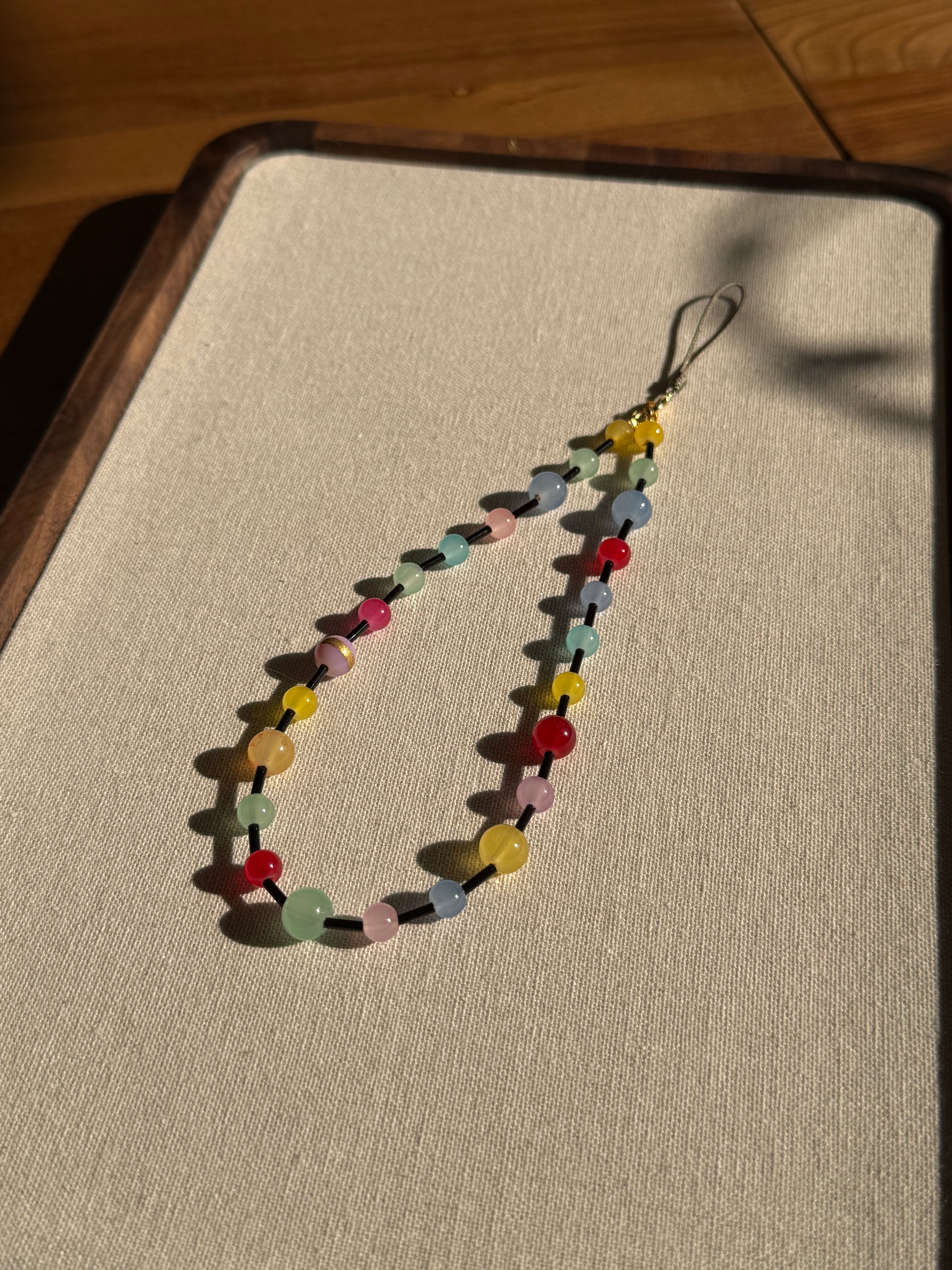 Crafted with glossy, candy colored round beads in soft pastels and bold brights, this charm is a perfect dose of sunshine for your phone, Kindle, camera, or bag. The alternating sizes and rainbow palette give it a playful, eye-catching balance like a little string of joy for your everyday essentials. Light, durable, and full of charm, it’s your go-to accessory for a sweet summer vibe.